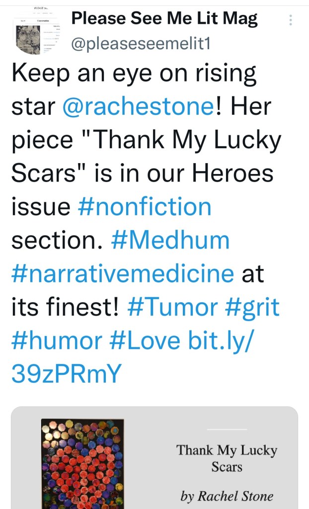 “Thank My Lucky Scars,” an intensely personal piece that almost never was, in the Heroes issue of literary journal for health-related stories Please See Me.